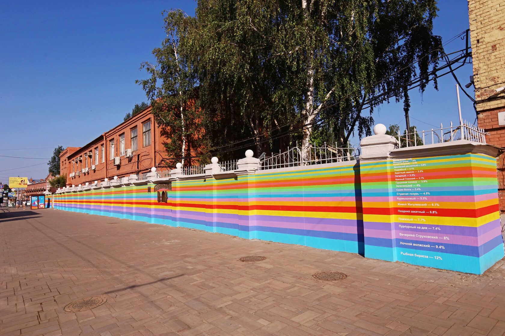 Кроме того, в процессе реализации проекта, заметил, что получается некий горизонтальный абстрактный пейзаж. Большинство самарцев голосовали за синие оттенки. Со стороны смотрелось так, словно Волга проглядывает сквозь забор.