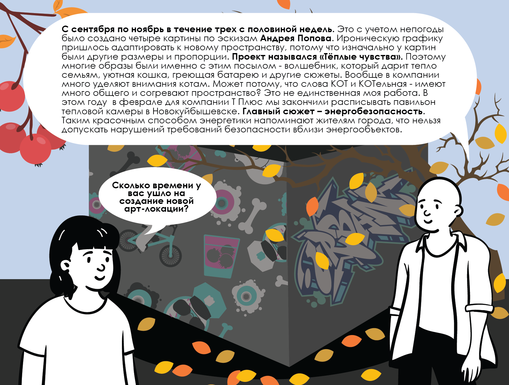 На кирпичной кладке энергообъекта ожили картины петербуржского художника Андрея Попова: добрый волшебник, несущий горожанам свет и уют, кошка, устроившаяся у батареи, маяк, дарящий надежду в темноте ночи, уютный дом, за окном которого видна морозная улица. Оформлением стены занимался самарский художник Алексей Заличев. Мы поговорили с ним о том, как создавался арт-объект: